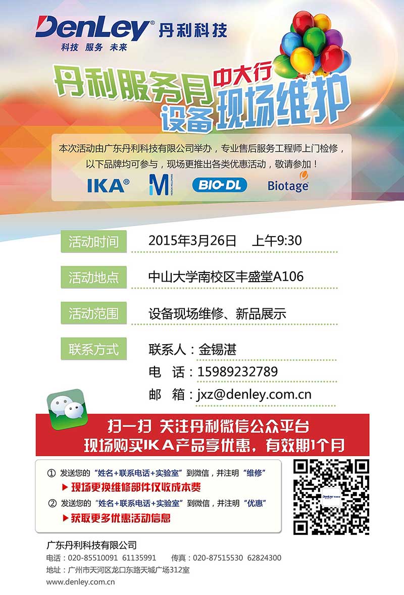 2015年3月26日上午9:30廣東丹利科技有限公司將在中山大學(xué)南校區(qū)豐盛堂A106室舉辦--丹利服務(wù)月 設(shè)備現(xiàn)場(chǎng)維護(hù)活動(dòng),專(zhuān)業(yè)售后服務(wù)工程師上門(mén)檢修,IKA、密理博、寶予德、Biotage等品牌均可參與,現(xiàn)場(chǎng)更推出各類(lèi)優(yōu)惠活動(dòng),敬請(qǐng)參加!
