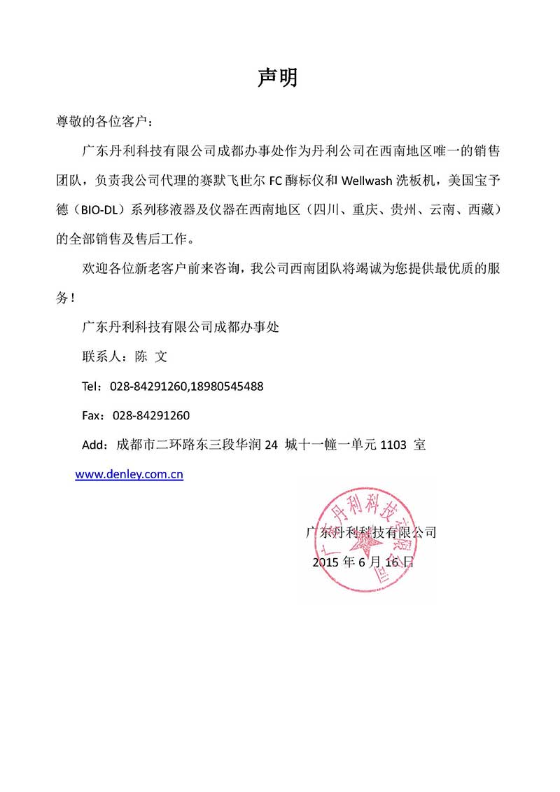 尊敬的各位客戶: 廣東丹利科技有限公司成都辦事處作為丹利公司在西南地區(qū)唯一的銷售團(tuán)隊,負(fù)責(zé)我公司代理的賽默飛世爾FC酶標(biāo)儀和Wellwash洗板機(jī),美國寶予德(BIO-DL)系列移液器及儀器在西南地區(qū)(四川、重慶、貴州、云南、西藏)的全部銷售及售后工作。