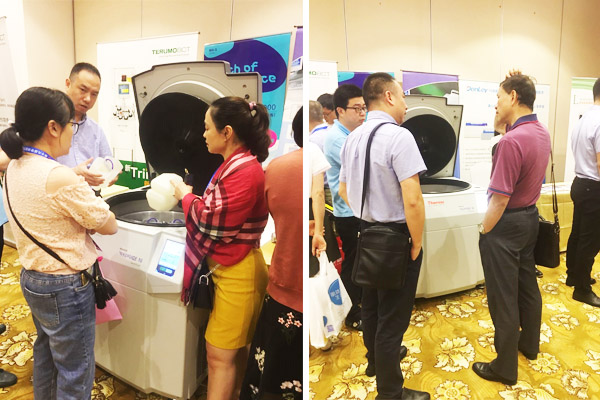 ThermoFisher Scientific 公司的大容量離心機(jī)在血站系統(tǒng)一直有著質(zhì)量可靠、離心產(chǎn)率高的美譽(yù)。本次盛會(huì)我們展示了ThermoFisher Heraeus Cryofuge 8 & 16大容量血站離心機(jī)樣機(jī)。該離心機(jī)以增大的16×500 mL血袋處理能力和友好的用戶設(shè)計(jì)來(lái)滿足血站的需求,使得大體積樣品離心更容易、更便捷。其軟件系統(tǒng)具有實(shí)驗(yàn)方案自動(dòng)轉(zhuǎn)化功能,能夠直接使用客戶現(xiàn)在的離心方法,減少了方法轉(zhuǎn)換帶來(lái)的繁瑣步驟。同時(shí),增強(qiáng)的人機(jī)工效、結(jié)構(gòu)緊湊的設(shè)計(jì),融入快速運(yùn)行設(shè)定、可追溯數(shù)據(jù)管理、高度實(shí)驗(yàn)重現(xiàn)性等功能,滿足血站大容量離心的人性化、智能化需求。可謂是為血站大容量離心量身定制的一款產(chǎn)品。在茶歇期間,很多血站機(jī)構(gòu)的專家領(lǐng)導(dǎo)都過(guò)來(lái)我們展位參觀咨詢。我們的李總及工程部、市場(chǎng)部和深圳辦同事們都熱情接待并詳細(xì)講解。