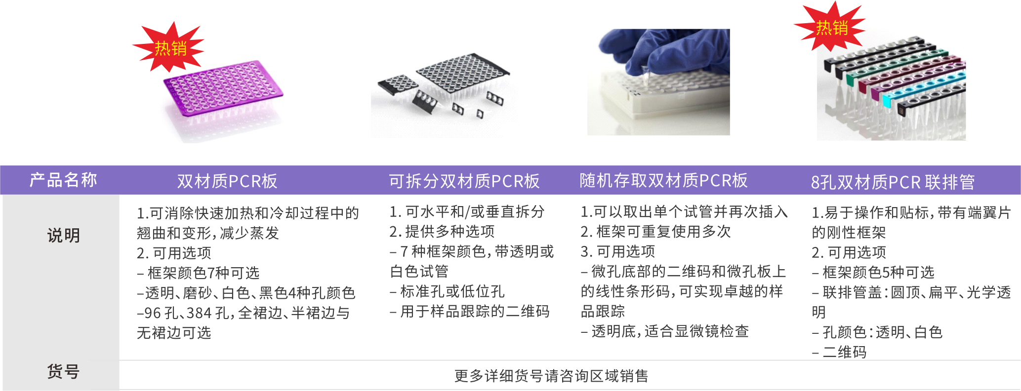 FrameStar®PCR板通過最大程度減小PCR管受熱膨脹來防止樣品損失,從而可選擇更小的實驗體積,節(jié)約試劑成本。雙組分設(shè)計融合了薄壁聚丙烯管(PP)的優(yōu)點從而可獲得最佳的PCR結(jié)果,同時剛性聚碳酸酯(PC)裙邊和框架提供最好的熱穩(wěn)定性和剛性,雙組分PCR板是自動化操作的首選。